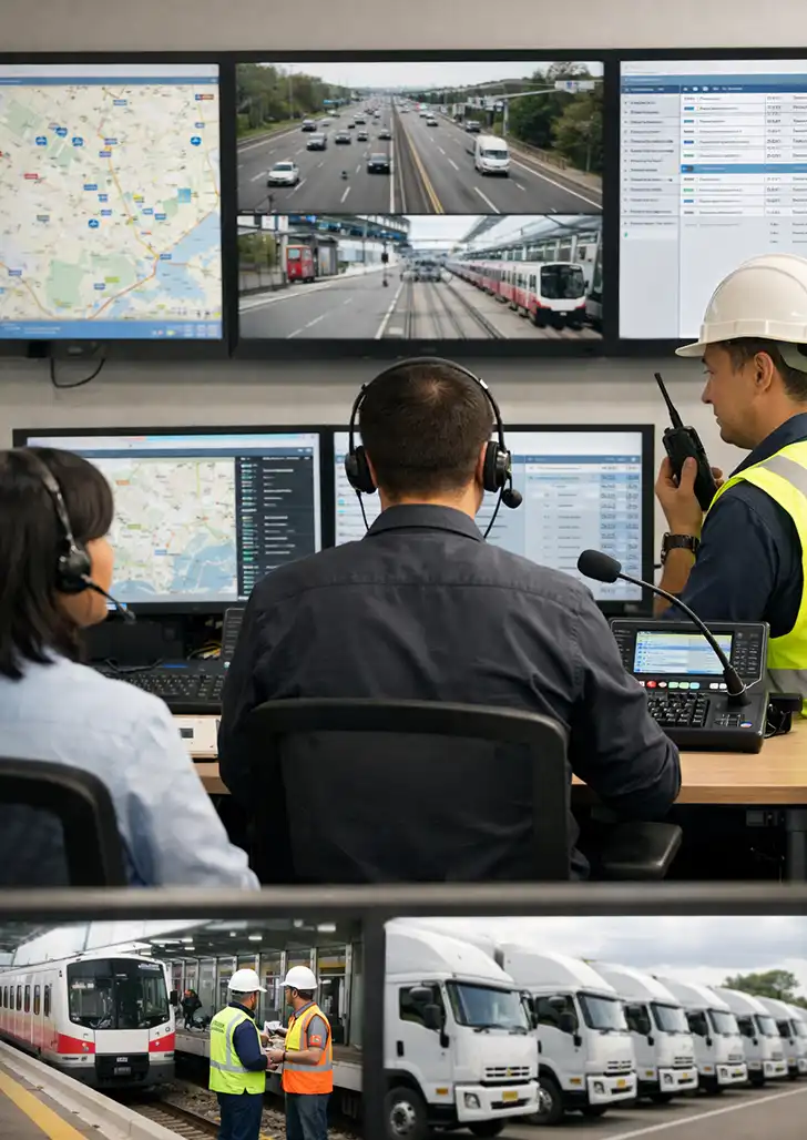 Transportation networks require real-time coordination between control centers and mobile assets.